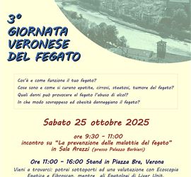 Il 25 ottobre 2025 in piazza Brà a Verona, dalle 11 alle 16, medici specialisti e infermieri dell’Unità operativa che si dedica alle Malattie del Fegato – Liver Unit saranno a disposizione di tutti i cittadini interessati a ricevere informazioni sull’importanza della prevenzione e diagnosi. Agli interessati, verrà inoltre proposto in modo gratuito di eseguire una ecografia del fegato e/o un’elastometria (Fibroscan) per la diagnosi di fegato grasso e/o di cirrosi epatica. Saranno disponibili anche medici specialisti della Chirurgia del Fegato, del Trapianto, della Gastroenterologia e delle Malattie Infettive, della Medicina delle Dipendenze. Le visite verranno eseguite presso strutture chiuse (camper).