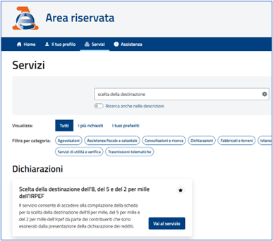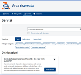 - Seleziona il Servizio. Una volta effettuato l'accesso, troverai nell'elenco dei "Servizi" la voce "Scelta della destinazione dell'8, del 5 e del 2 per mille dell'IRPEF". Clicca su di essa per avviare la procedura.