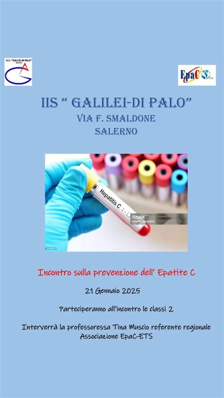 Il 21 gennaio 2025 la prof.ssa Tina Muscio, referente dell’associazione EpaC-ETS, ha incontrato gli alunni delle classi 2 dell' IIS Galilei- Di Palo di Salerno, per parlare di prevenzione dell’epatite c , con riferimento a tatuaggi, piercing e trattamenti estetici da fare in sicurezza, per evitare una possibile trasmissione del virus dell’epatite c e di altri virus.