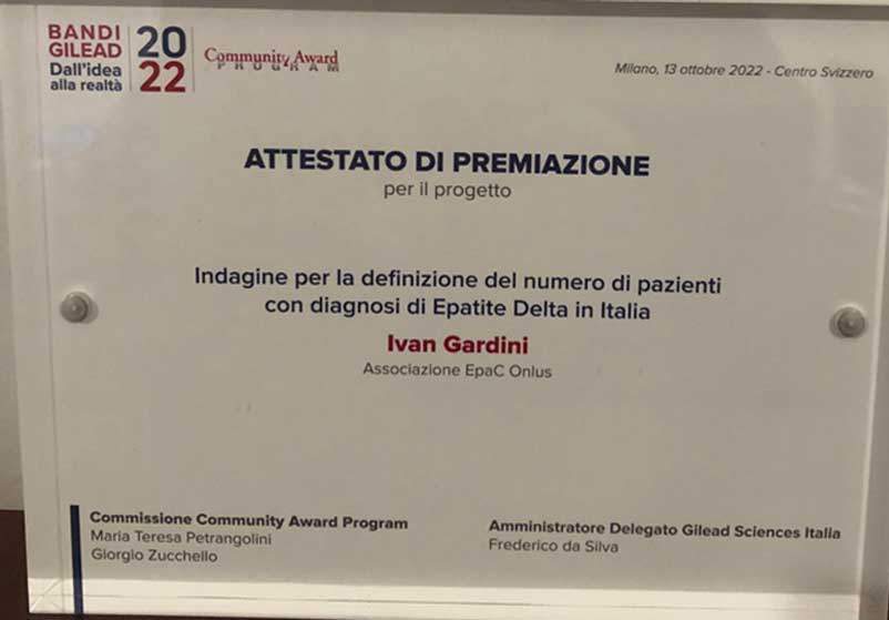 Con una punta di orgoglio, vi annunciamo di essere tra le Associazioni premiate nella undicesima edizione dei Bandi di Gilead Sciences con il progetto "Indagine per la definizione del numero di pazienti con diagnosi di Epatite Delta in Italia" dedicato a modelli di accesso precoce ai test diagnostici su specifiche malattie infettive e accesso alle cure.