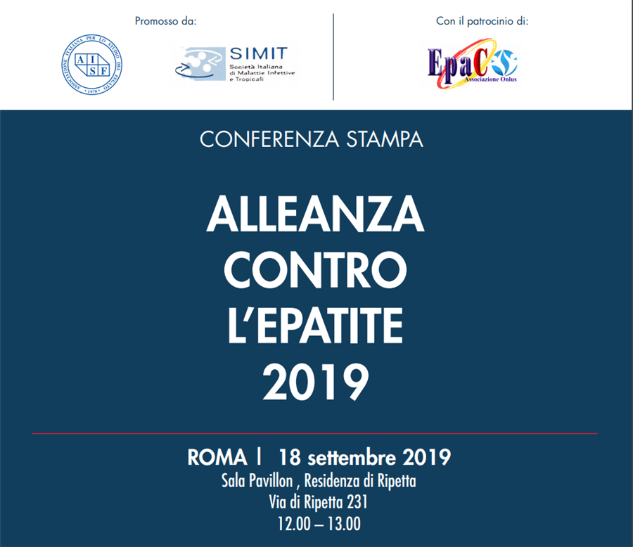 A Roma, mercoledì 18 Settembre presso la sala Pavillon della Residenza di Ripetta in via di Ripetta 231, dalle 12.00 alle 13.00 si svolgerà la conferenza stampa dell’Alleanza Contro Epatite 2019