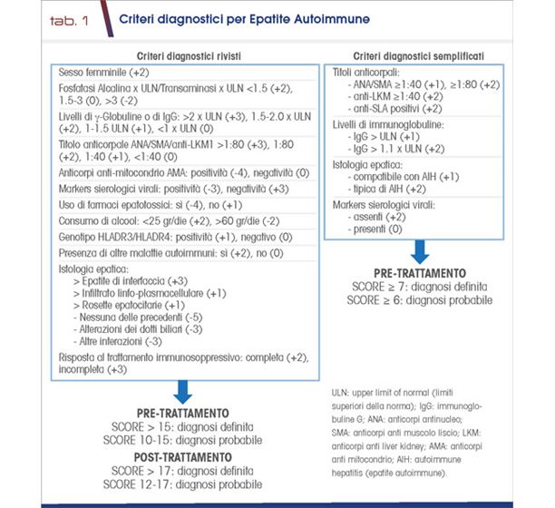 La diagnosi di EA non si avvale di un test patognomonico ma è affidata alla contemporanea presenza di diversi elementi clinici, biochimici, sierologici (autoanticorpi) e istologici, unitamente all’esclusione di patologie concomitanti (Tab. 1). L’indagine radiologica non ha un ruolo diagnostico ma è utile per escludere un overlap con la colangite sclerosante primitiva o a fini di stadiazione. L’EA spesso viene diagnosticata assieme ad altre patologie autoimmuni, in particolare tireopatie autoimmuni e connettiviti sistemiche.