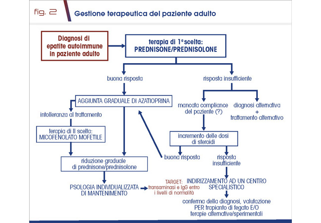 Il trattamento farmacologico d’elezione è rappresentato dalla terapia a base di steroide e/o farmaci immunosoppressori. Tale terapia ha come scopo biologico la riduzione dell’attività linfocitica e conseguentemente dell’infiammazione epatica; tale effetto biologico si traduce clinicamente nella risoluzione dei sintomi (qualora presenti), nella normalizzazione delle transaminasi e del livello di IgG sieriche (remissione biochimica). La risposta biochimica migliora la sopravvivenza dei pazienti e si associa a risoluzione della flogosi epatica a livello istologico con stabilità/miglioramento della fibrosi (remissione istologica) nella maggior parte dei casi (7) (Fig. 2).