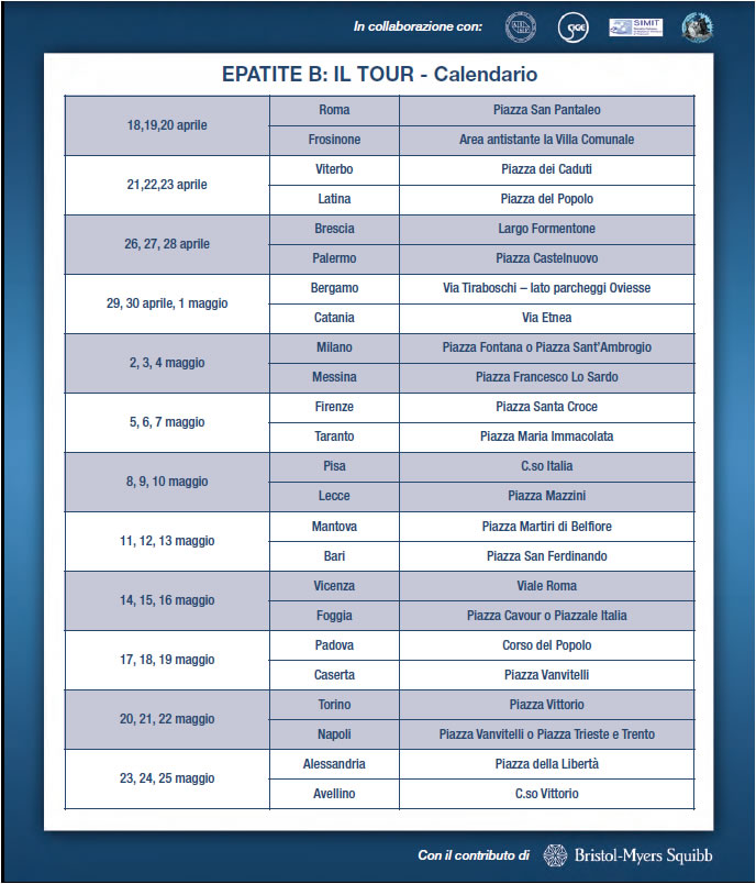 Il 18 aprile 2009 partirà “Epatite B: il tour”, una campagna informativa itinerante sull’epatite virale di tipo B destinata a sensibilizzare i cittadini sull’importanza della prevenzione e della diagnosi precoce di questa patologia.