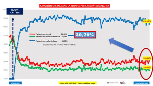Perché salvavita? Perché i dati degli avviamenti terapeutici settimanali divulgati da AIFA parlano chiaro: il 30% dei pazienti che inizia una cura con i farmaci innovativi ha una cirrosi (20%) o una malattia avanzata (10%)1. Tutti pazienti che rischiano il tumore del fegato. E solo nel 2019 sono stati avviati al trattamento oltre 10.000 pazienti con malattia avanzata e avanzatissima. Come mai questi pazienti non sono stati curati negli anni precedenti?