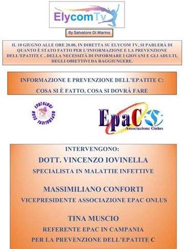 ll 10 Giugno alle ore 20,00 ,in diretta facebook su Elycom tv , si parlerà di informazione e prevenzione dell’epatite C.