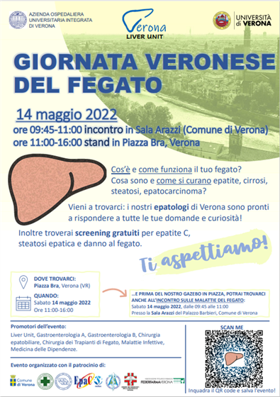 Il 14 maggio 2022 in piazza Bra a Verona, dalle 11 alle 16, verrà allestito uno stand dove medici specialisti e infermieri dell’Unità Operativa che si dedica alle Malattie del Fegato – Liver Unit saranno a disposizione di tutti i cittadini interessati a ricevere informazioni sull’importanza della prevenzione e diagnosi.