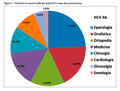 È stata valutata la provenienza dei pazienti con HCVAb positività dalle varie unità operative della nostra struttura. Il 23,3% dei pazienti sono stati identificati durante ricoveri nel reparto di epatologia, mentre il 18,2 e il 14.2 % dei pazienti sono stati identificati in pre-ospedalizzazione dai reparti rispettivamente di oculistica e ortopedia.
