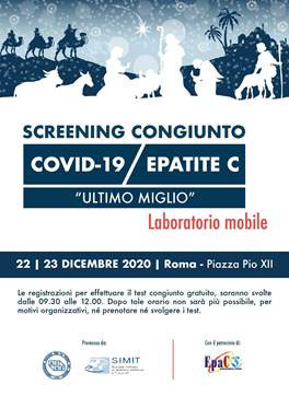 Il roadshow itinerante con test sierologico congiunto gratuito Covid 19-Epatite C, torna a Roma. Il 22 e 23 dicembre in piazza Pio XII sarà operativo il laboratorio mobile promosso da Aisf (Associazione Italiana per lo Studio del Fegato) e Simit (Società Italiana di Malattie Infettive e Tropicali) con il patrocinio dell’Associazione Pazienti «EpaC Onlus»per l’ultimo miglio verso lo screening nazionale gratuito di 17 milioni di cittadini che servirà ad eradicare l’Epatite C entro il 2030 in Italia.