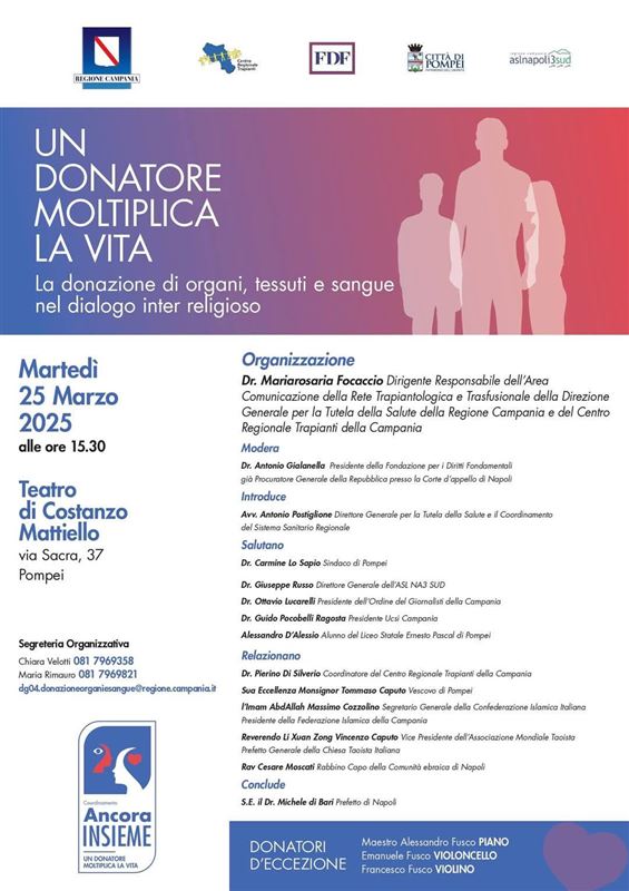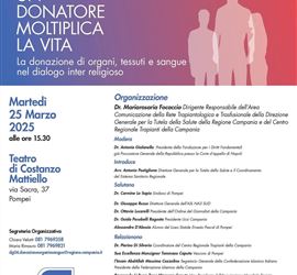 Il 25 marzo 2025, presso il teatro Di Costanzo Mattiello di Pompei, si è svolto l’evento “ Un Donatore moltiplica la vita” sull’importanza della donazione di organi, tessuti e cellule nel dialogo inter religioso.