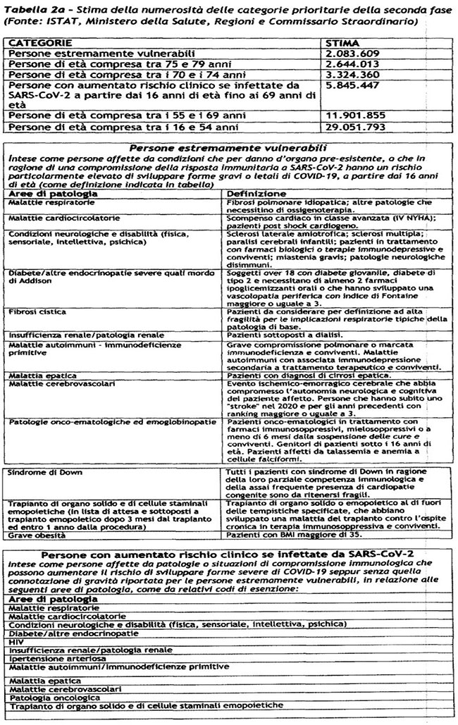 Il criterio per stabilire l'ordine di priorità è quello del maggior rischio di letalità correlato al Covid-19. I parametri presi in considerazione allo scopo, sulla base delle analisi condotte dagli studi scientifici a disposizione, sono l'età e la presenza di condizioni patologiche che rappresentano le variabili principati di correlazione con la mortalità per Covid-19. La scelta è stata condivisa con il Consiglio Superiore di Sanità che ha dato parere positivo ed è stato oggetto di un confronto con il Presidente e alcuni componenti del Comitato Nazionale di Bioetica.