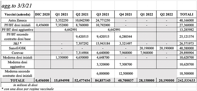 Tabella 1c - Stima della potenziale quantità di dosi di vaccino disponibili (in milioni) In Italia nel 2021, per trimestre (Q) e per azienda produttrice, in base ad accordi preliminari d'acquisto (APA) sottoscritti dalla Commissione europea e previa AIC